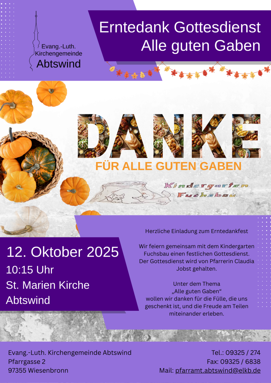 Am 12. Oktober laden wir herzlich zum Erntedankfest ein. Gemeinsam mit dem Kindergarten Fuchsbau feiern wir einen festlichen Gottesdienst, der von Pfarrerin Claudia Jobst gestaltet wird.