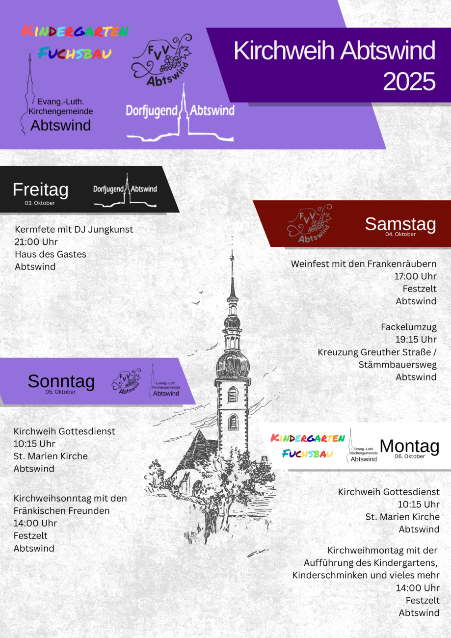 ...in der evangelisch-lutherischen Kirchengemeinde Abtswind am Fuß des Steigerwaldes. Zur Kirchengemeinde Abtswind zählen etwa 450 Gemeindeglieder. Seit 1.10.2024 bilden die Kirchengemeinden von Abtswind und Wiesenbronn die Pfarrei Wiesenbronn-Abtswind.