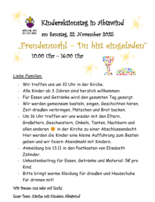Unter dem Thema „Alle guten Gaben“ wollen wir uns bewusst machen, wie reich wir beschenkt sind – mit Nahrung, Gemeinschaft und den kleinen und großen Freuden des Lebens. Kinder und Erzieherinnen des Kindergartens bereichern den Gottesdienst mit Beiträgen, die sie mit viel Freude vorbereitet haben.